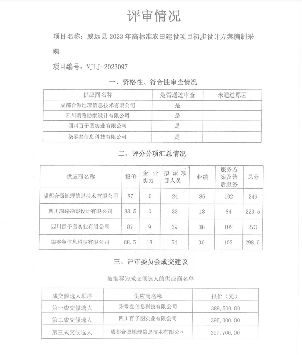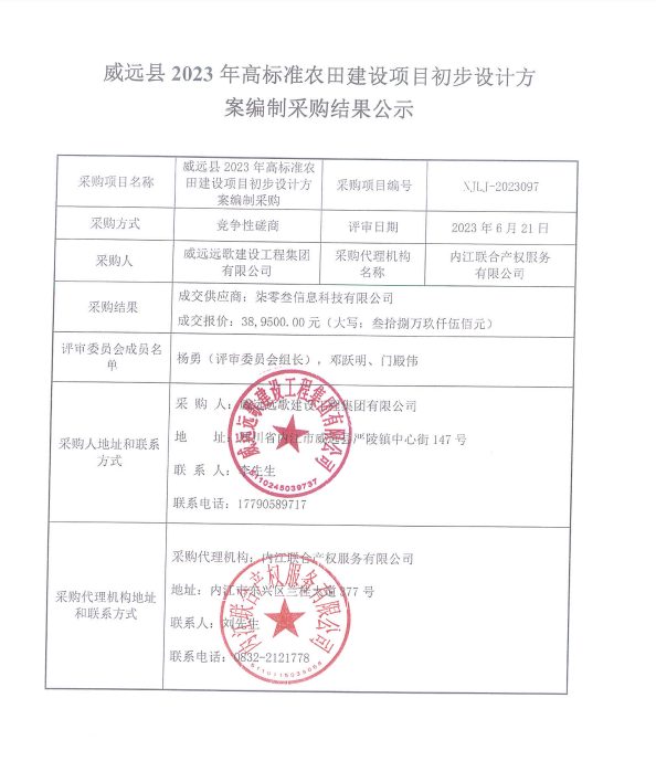 威遠縣2023年高標準農田建設項目初步設計方案編制采購結果公示