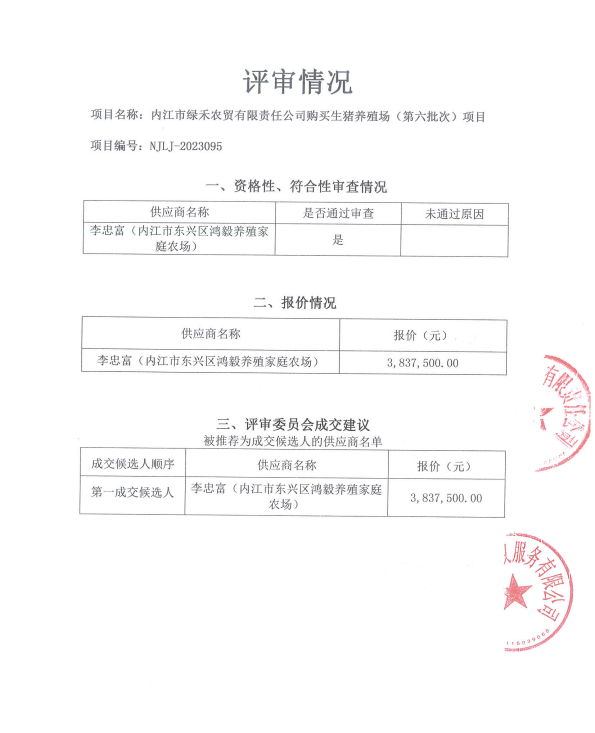 內(nèi)江市綠禾農(nóng)貿(mào)有限責(zé)任公司購買生豬養(yǎng)殖場(chǎng)(第六批次)項(xiàng)目結(jié)果公告