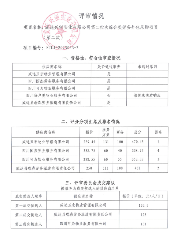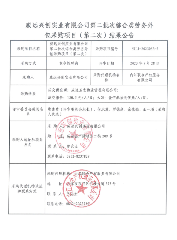 威遠(yuǎn)興創(chuàng)實(shí)業(yè)有限公司第二批次綜合類勞務(wù)外包采購項(xiàng)目(第二次)結(jié)果公告