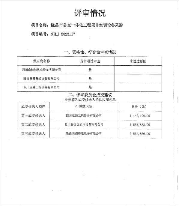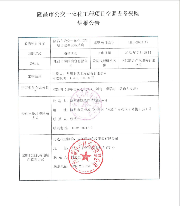 隆昌市公交一體化工程項(xiàng)目空調(diào)設(shè)備采購結(jié)果公告