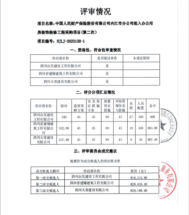 中國(guó)人民財(cái)產(chǎn)保險(xiǎn)股份有限公司內(nèi)江市分公司租入辦公用房裝飾裝修工程采購(gòu)項(xiàng)目(第二次)結(jié)果公示