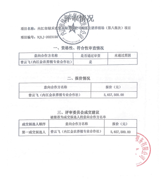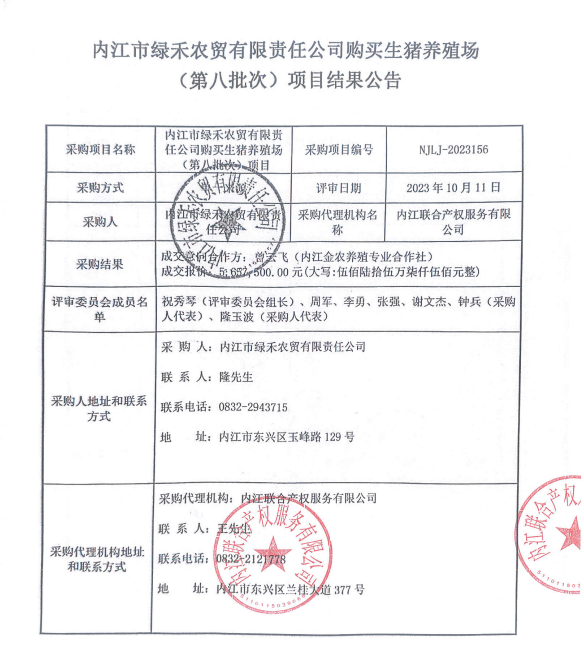 內(nèi)江市綠禾農(nóng)貿(mào)有限責任公司購買生豬養(yǎng)殖場(第八批次)項目結(jié)果公告