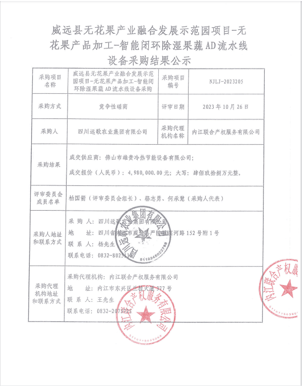 威遠縣無花果產(chǎn)業(yè)融合發(fā)展示范園項目-無花果產(chǎn)品加工-智能閉環(huán)除濕果蔬AD流水線設(shè)備采購結(jié)果公示
