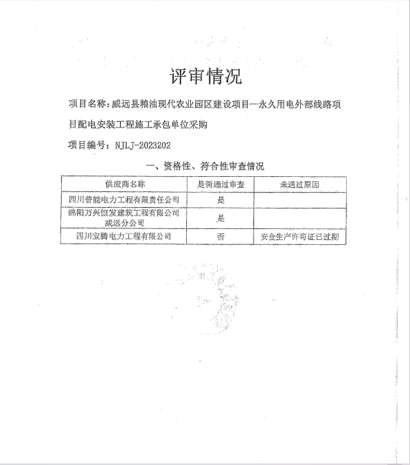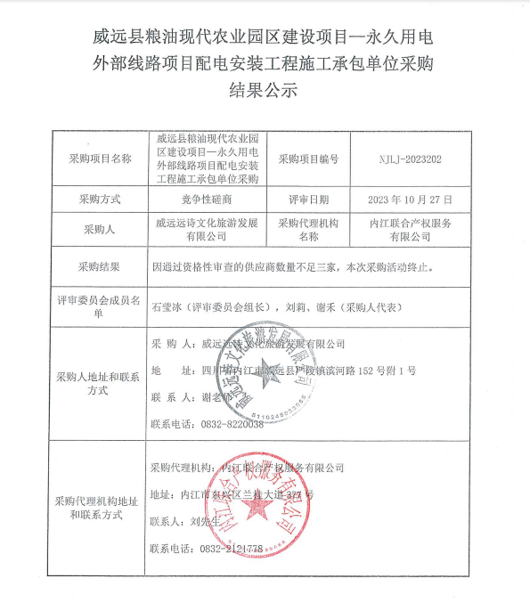 威遠縣糧油現(xiàn)代農(nóng)業(yè)園區(qū)建設項目—永久用電外部線路項目配電安裝工程施工承包單位采購結(jié)果公示