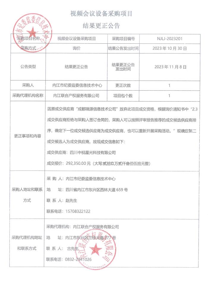 視頻會議設備采購項目結(jié)果更正公告