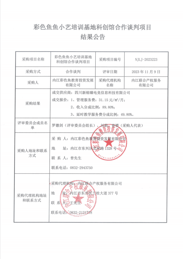 彩色魚魚小藝培訓(xùn)基地科創(chuàng)館合作談判項目結(jié)果公告