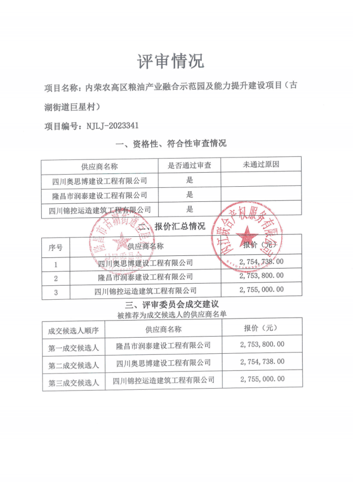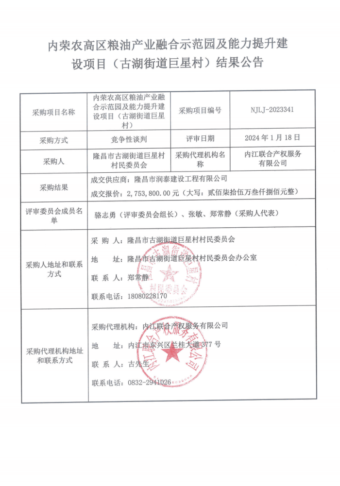 內(nèi)榮農(nóng)高區(qū)糧油產(chǎn)業(yè)融合示范園及能力提升建設(shè)項目(古湖街道巨星村)結(jié)果公告