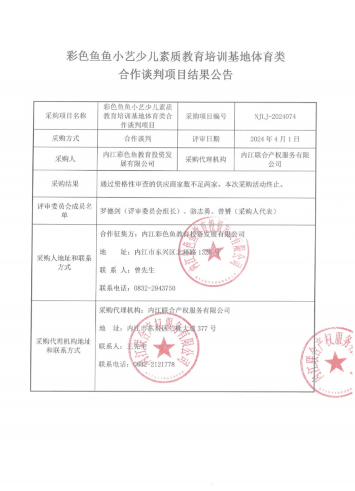 彩色魚魚小藝少兒素質(zhì)教育培訓(xùn)基地體育類合作談判項(xiàng)目結(jié)果公告