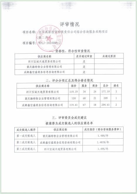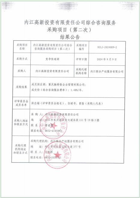 內(nèi)江高新投資有限責(zé)任公司綜合咨詢服務(wù)采購(gòu)項(xiàng)目(第二次)結(jié)果公告