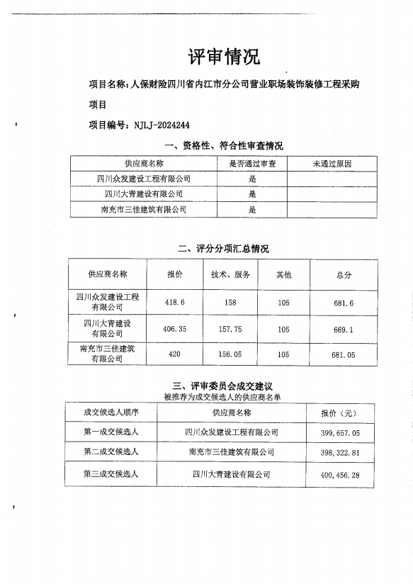 人保財險四川省內(nèi)江市分公司營業(yè)職場裝飾裝修工程采購項目結(jié)果公告