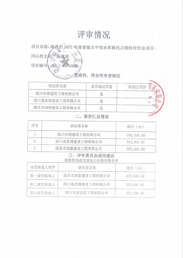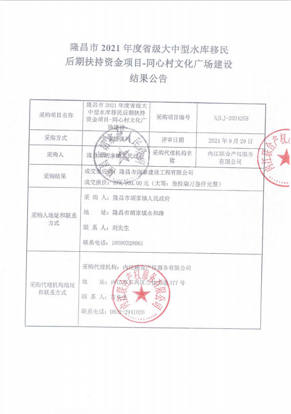 隆昌市2021年度省級(jí)大中型水庫移民后期扶持資金項(xiàng)目-同心村文化廣場建設(shè)結(jié)果公告