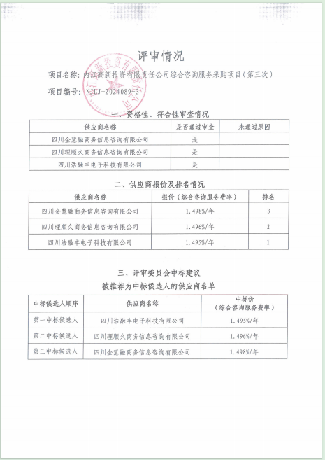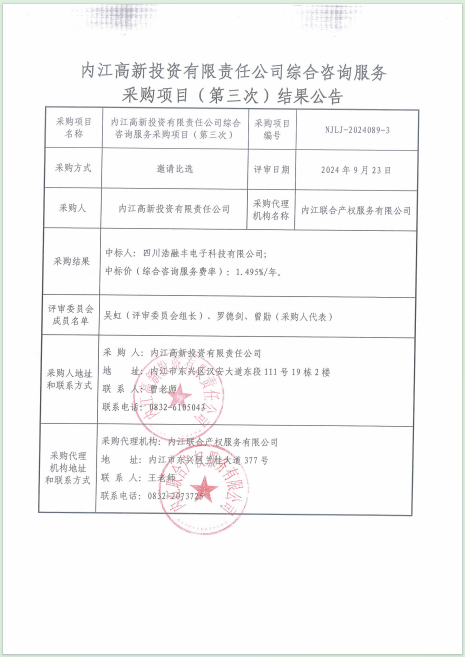 內(nèi)江高新投資有限責(zé)任公司綜合咨詢服務(wù)采購項(xiàng)目(第三次)結(jié)果公告