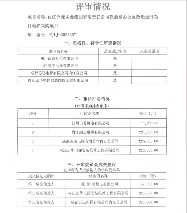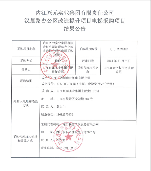 內(nèi)江興元實業(yè)集團有限責任公司漢晨路辦公區(qū)改造提升項目電梯采購項目結果公告