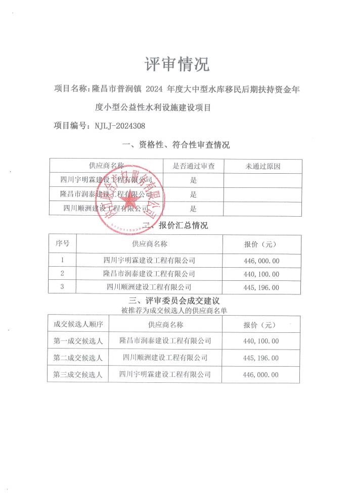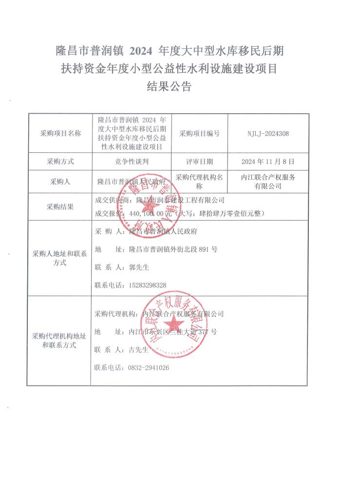 隆昌市普潤(rùn)鎮(zhèn) 2024 年度大中型水庫(kù)移民后期扶持資金年度小型公益性水利設(shè)施建設(shè)項(xiàng)目結(jié)果公告
