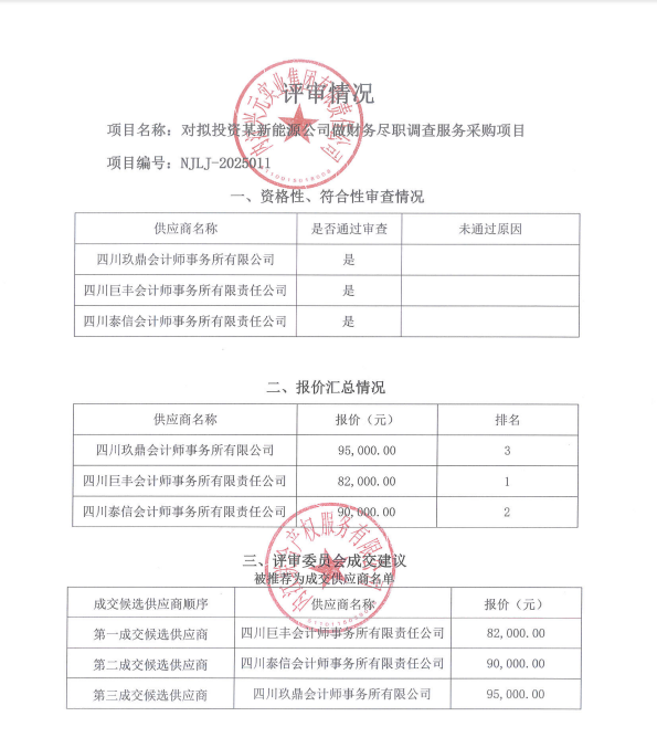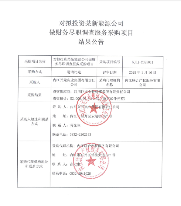 對(duì)擬投資某新能源公司做財(cái)務(wù)盡職調(diào)查服務(wù)采購(gòu)項(xiàng)目結(jié)果公告