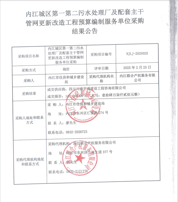 內(nèi)江城區(qū)第一第二污水處理廠及配套主干管網(wǎng)更新改造工程預(yù)算編制服務(wù)單位采購結(jié)果公告