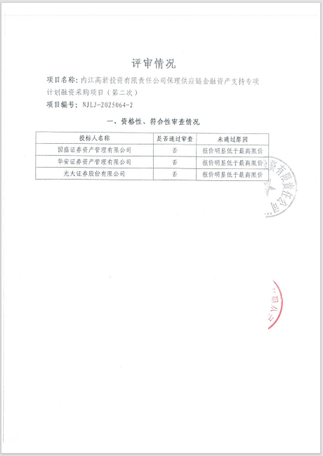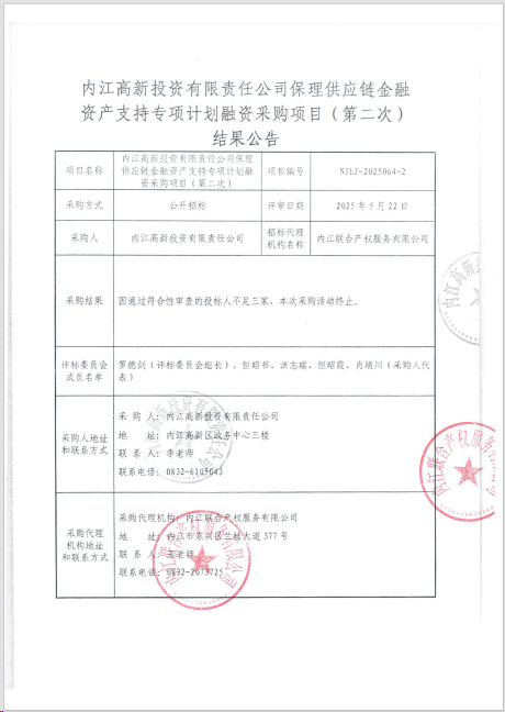 內(nèi)江高新投資有限責(zé)任公司保理供應(yīng)鏈金融資產(chǎn)支持專項(xiàng)計(jì)劃融資采購(gòu)項(xiàng)目(第二次)結(jié)果公告