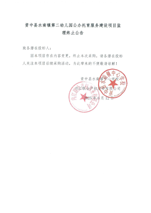 資中縣水南鎮(zhèn)第二幼兒園公辦托育服務(wù)建設(shè)項(xiàng)目監(jiān)理終止公告