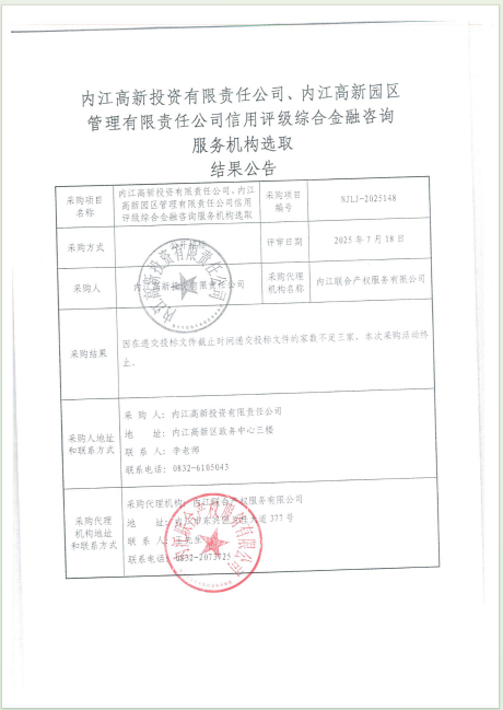 內(nèi)江高新投資有限責(zé)任公司、內(nèi)江高新園區(qū)管理有限責(zé)任公司信用評(píng)級(jí)綜合金融咨詢服務(wù)機(jī)構(gòu)選取結(jié)果公告