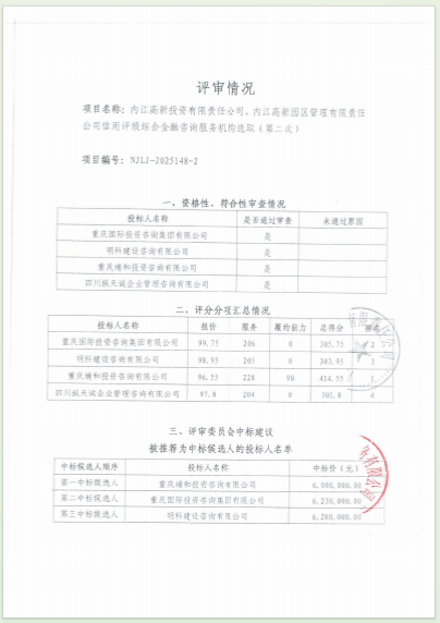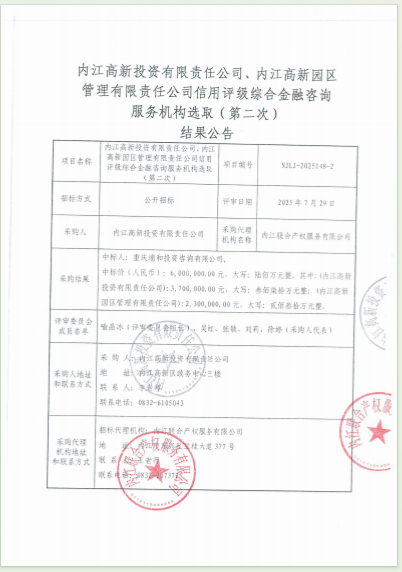 內江高新投資有限責任公司、內江高新園區(qū)管理有限責任公司信用評級綜合金融咨詢服務機構選取(第二次)結果公告