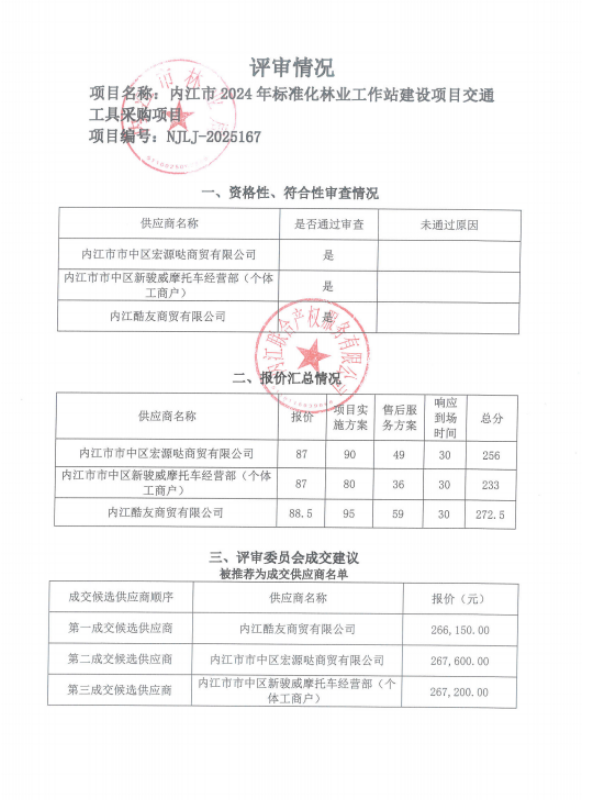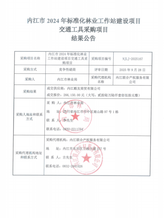 內(nèi)江市2024年標(biāo)準(zhǔn)化林業(yè)工作站建設(shè)項(xiàng)目交通工具采購(gòu)項(xiàng)目結(jié)果公告