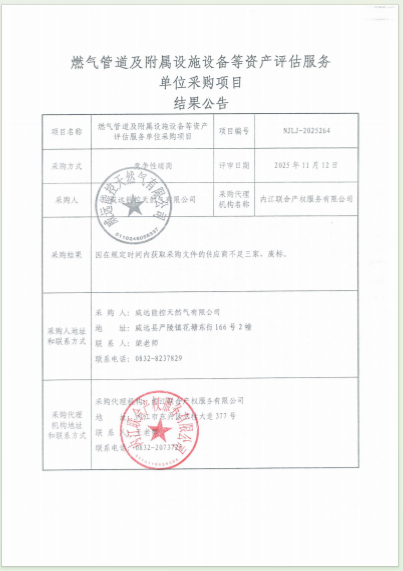 燃氣管道及附屬設施設備等資產(chǎn)評估服務單位采購項目結果公告