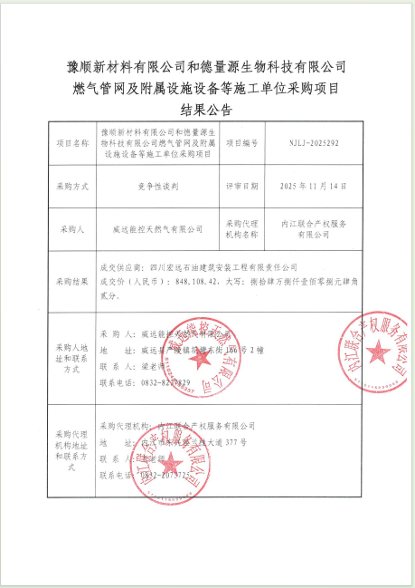 豫順新材料有限公司和德量源生物科技有限公司燃氣管網(wǎng)及附屬設(shè)施設(shè)備等施工單位采購項目結(jié)果公告