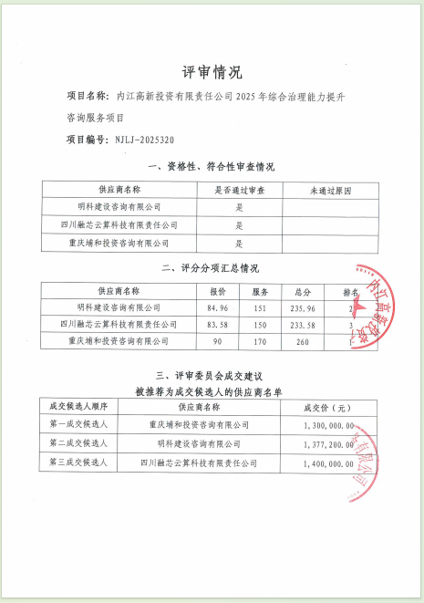 內(nèi)江高新投資有限責(zé)任公司2025年綜合治理能力提升咨詢服務(wù)項(xiàng)目結(jié)果公告