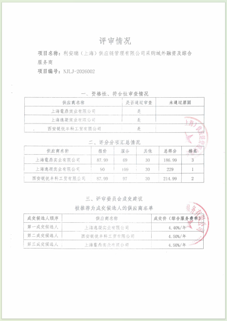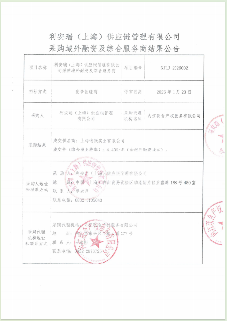 利安瑞(上海)供應(yīng)鏈管理有限公司采購(gòu)域外融資及綜合服務(wù)商結(jié)果公告
